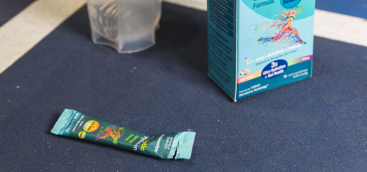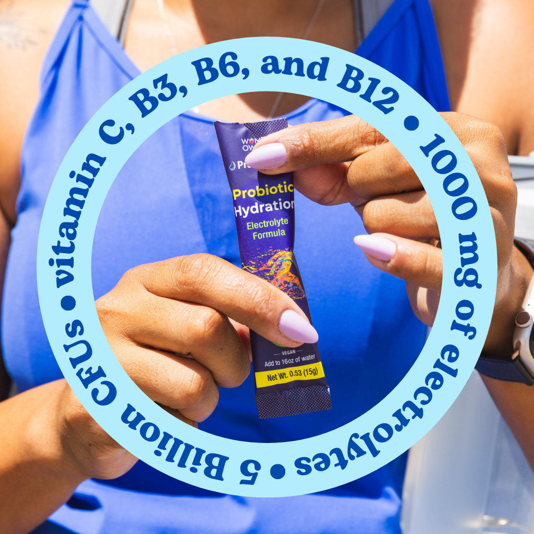 Every stick pack of Probiomlyte includes probiotics, electrolytes, and vitamins!